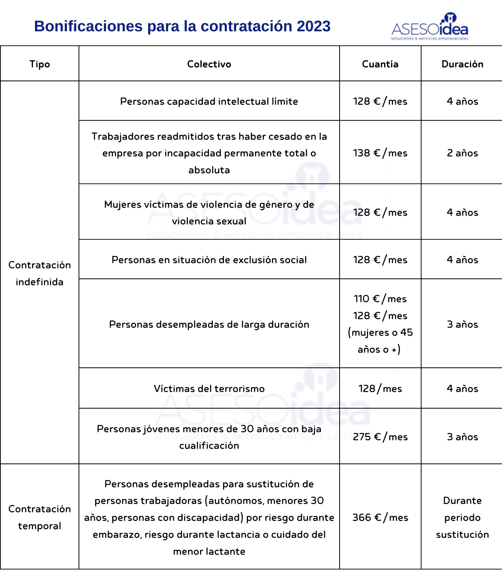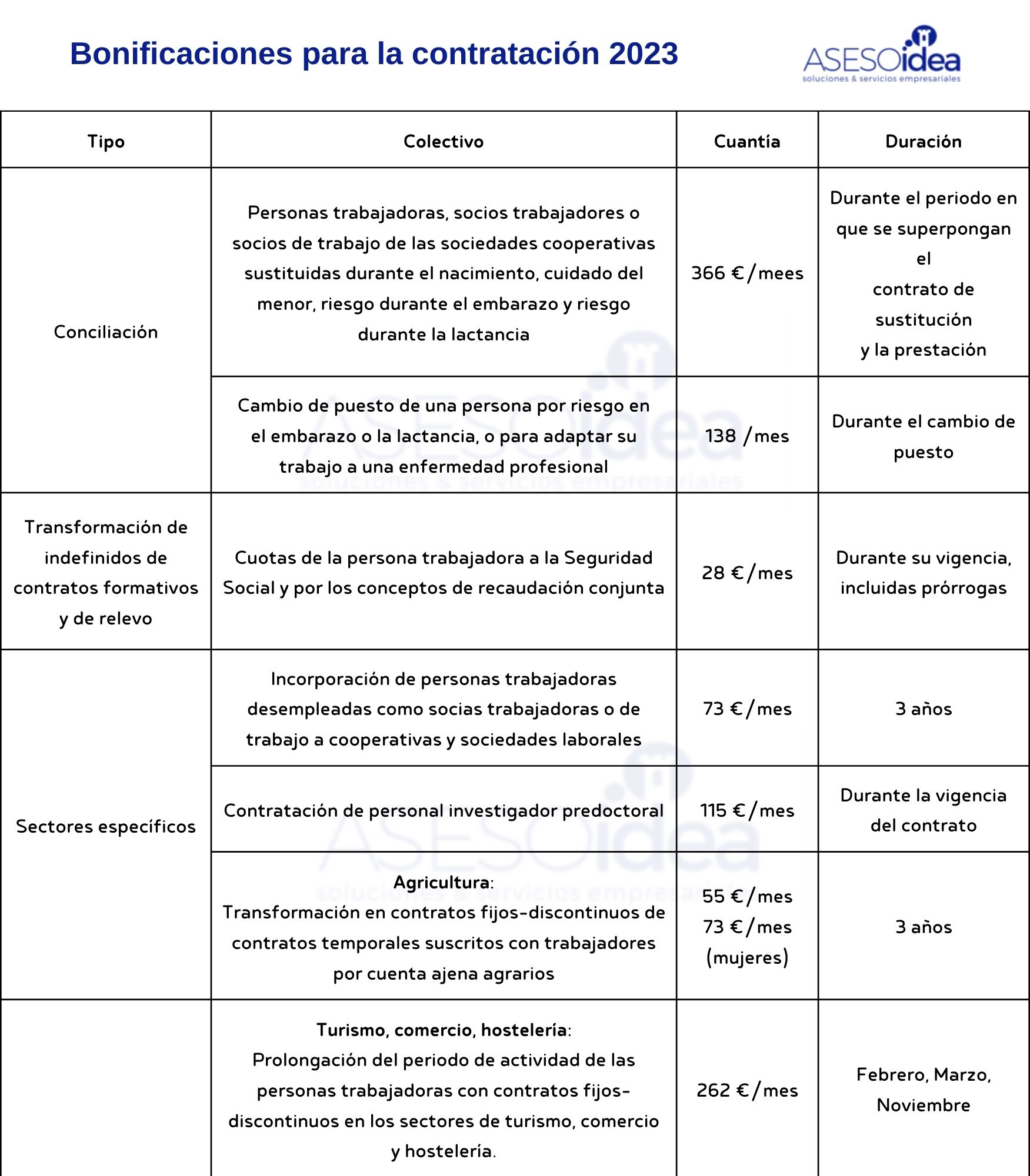 A continuación te dejamos la tabla con todas las bonificaciones de contratación 2023: